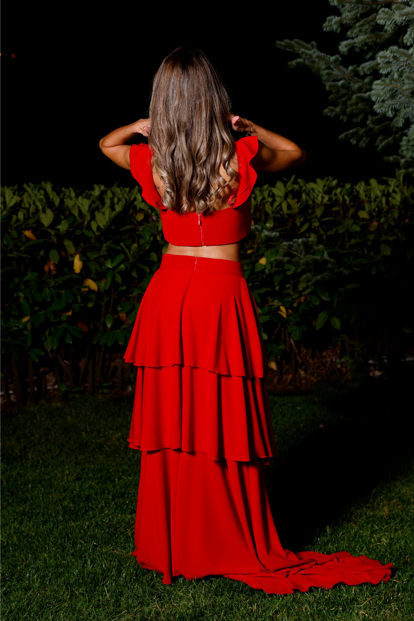 Elegant yet enticing, the Amour Rouge Set captures traditional elegance with a modern twist, embodying the true beauty of the feminine. It features a structured crop, with delicate flutter sleeves, and a flowing tiered maxi skirt. In designing this piece, Loulwa uses the red hue to evoke passion and confidence, with the layered skirt adding depth and beauty, a true celebration of romance. Perfect for evening soirées, summer nights, or a statement look that lingers in memory.