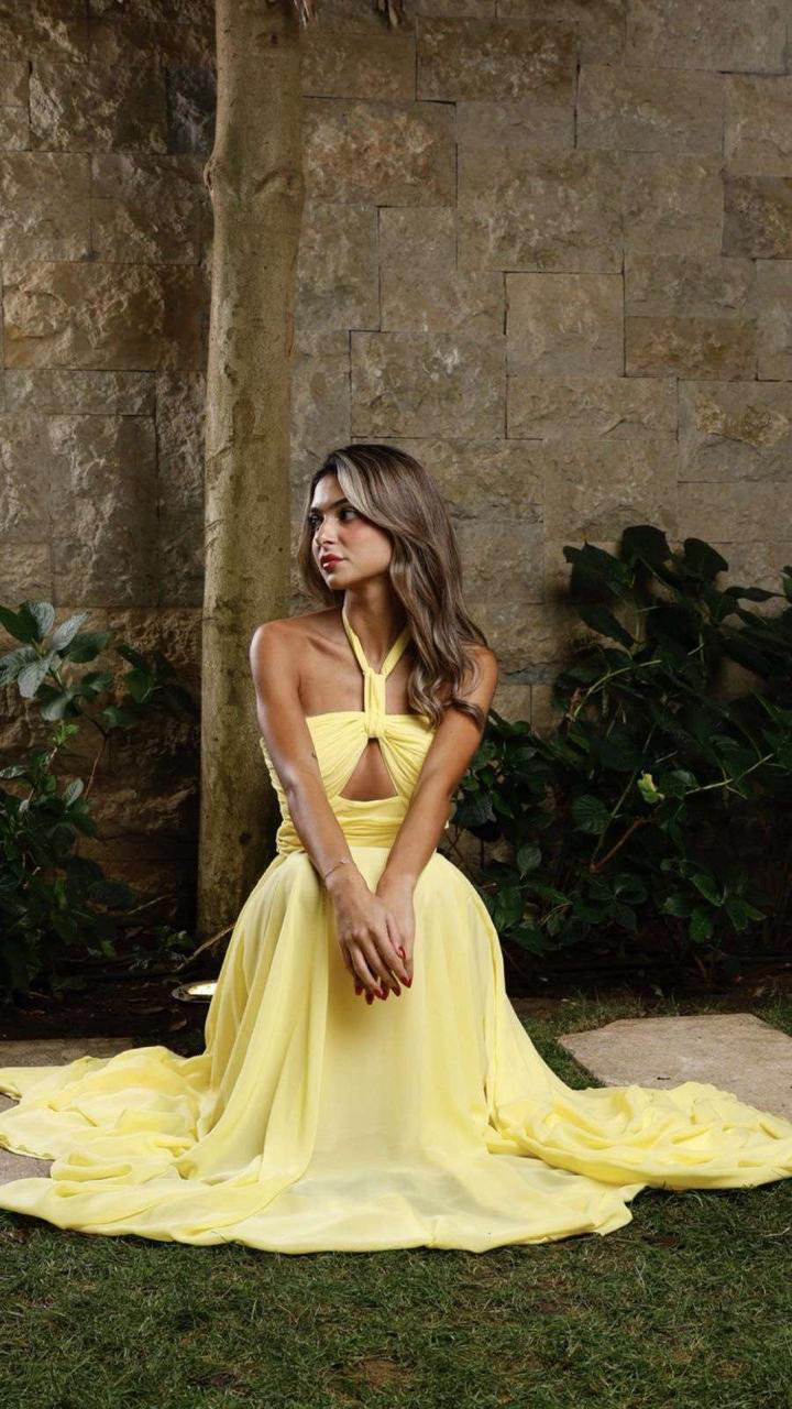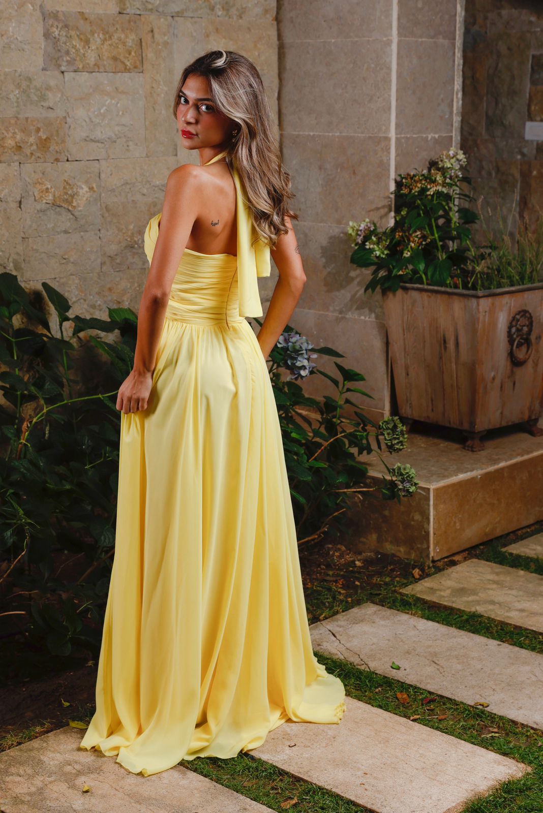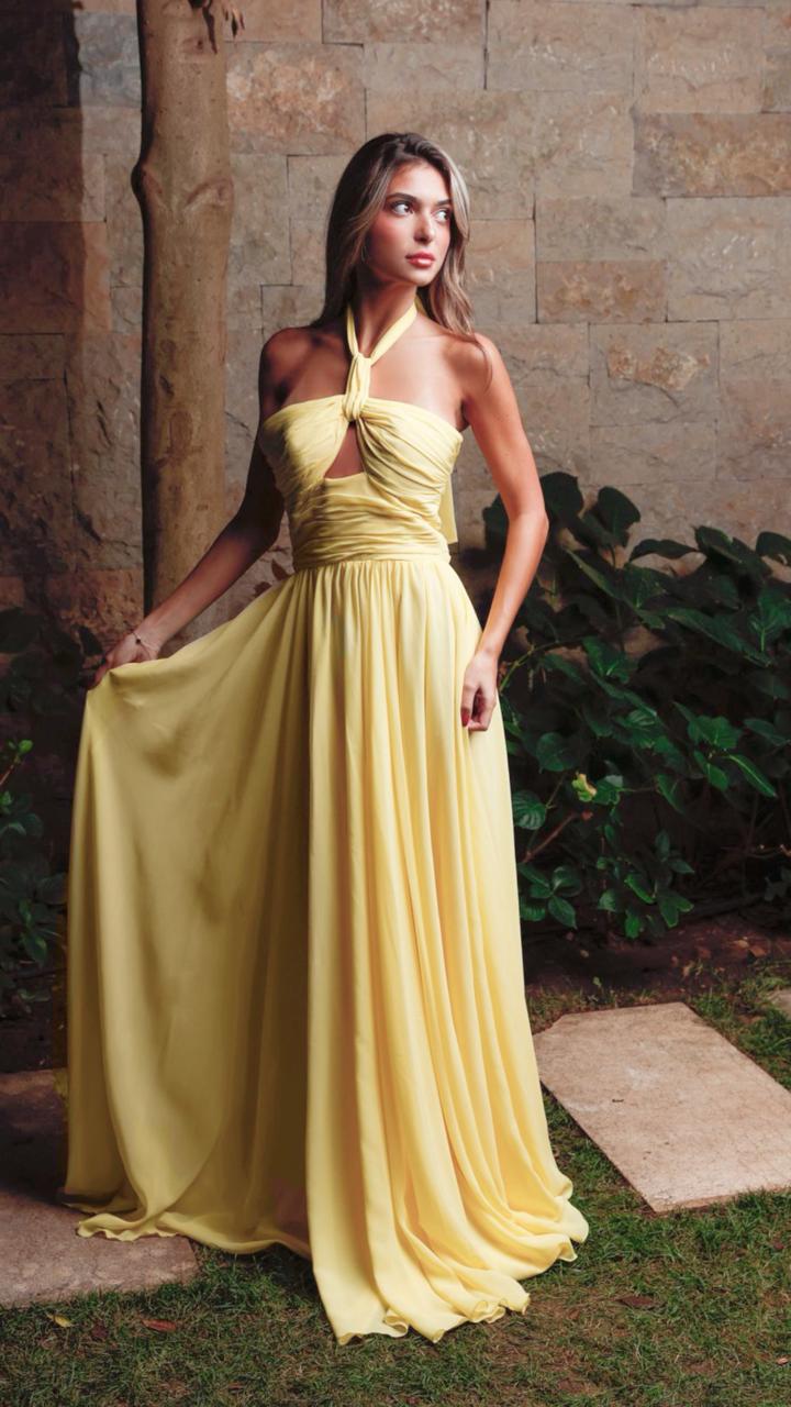 The Starlight Glow dress sparkles like a star. With a flowing silhouette in a luminous yellow, designed by Loulwa, it moves gracefully and effortlessly, catching light with each step. The flowing fabric produces an effortless yet eye-catching glow, and the delicate knot detail at the halter neckline adds sophistication. For the woman who was destined to shine, Starlight Glow is the perfect piece.
