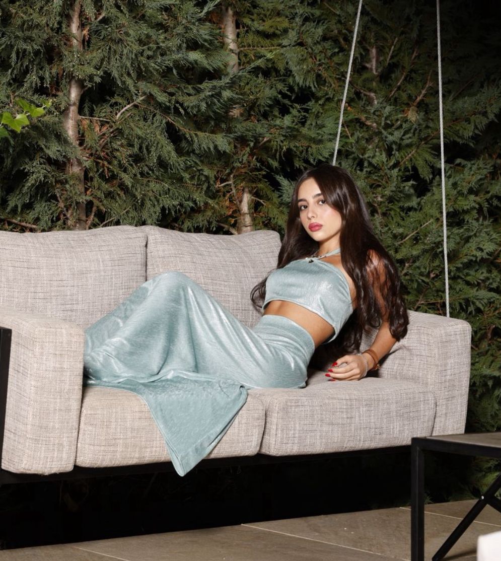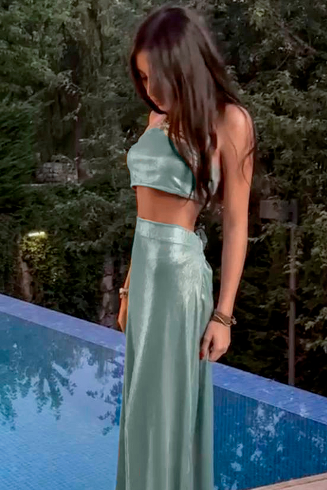 The Jasmine's Dream Set is a statement. Made of silky, shiny fabric, the set catches the light as it moves, flowing like water. The silhouette demonstrates confidence and charm, while the aqua-blue shade evokes fairytale magic. Soft, graceful, and powerful all at once, this is elegance with a twist. This piece was created by Loulwa for the woman who is in control of her presence. Unforgettable energy and undeniable beauty, this is the Jasmine’s Dream Set. Become the dream they will never forget.