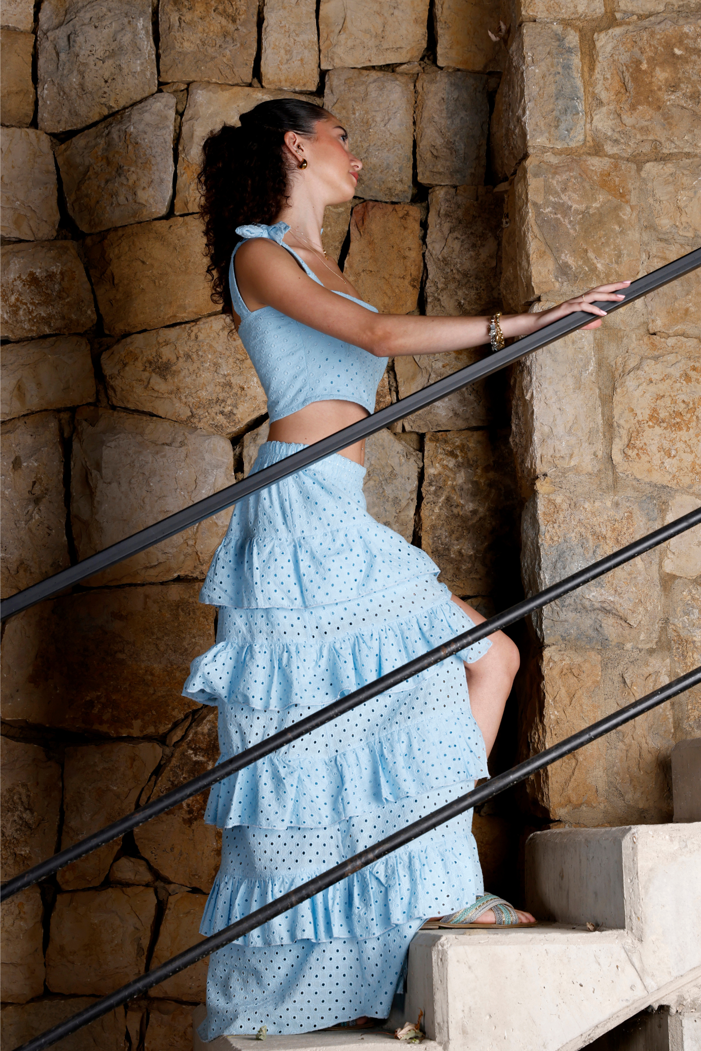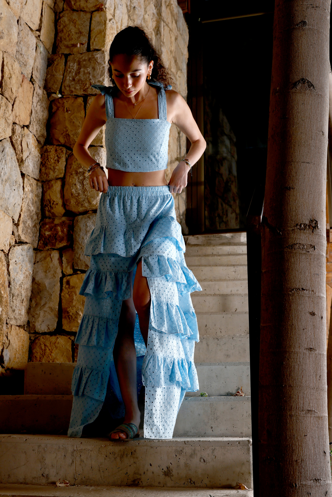 The Angel Blue Set is a welcome change, sweet and playful. Its soft ruffles and baby-blue broderie fabric gives it a carefree, cheerful vibe that is nostalgic of summertime laughter and warm weather. The flowing skirt gives a princess look & the top's delicate shoulder straps tie into soft bows, adding a touch of innocence to the simple yet youthful top. You feel at ease, bright, and naturally attractive wearing this type of set. The sweet, playful, and unforgettable innocence of summer days was captured in Loulwa's design. Every moment is made extra special by Angel Blue, whether it's for garden parties, afternoons by the sea, or evenings that last past sunset.